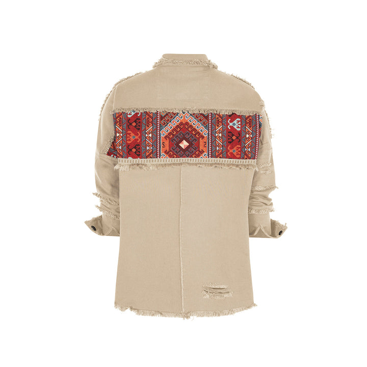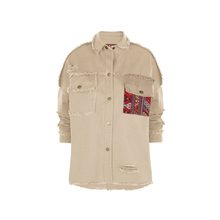 Embrace effortless style with this oversized shacket in cotton drill, where laid-back meets luxe. This standout piece features distinctive loom details on the back and pocket, enriched with fringe accents...